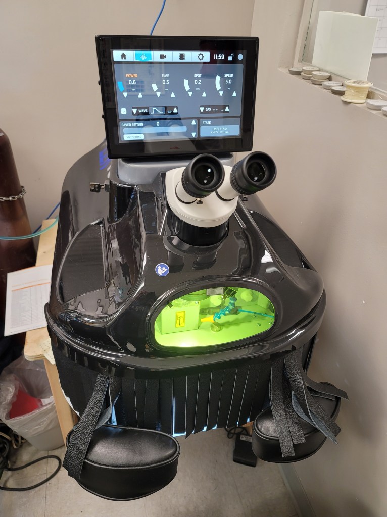 I use this wonderful tool every day. It’s a Z-Tech 180 Joule water cooled YAG laser. Have over 10 million fires on it. It’ll weld any weldable metal alloy (provided you have the proper filler wire.) It has required a fair bit of maintenance- I often get to play laser technician and have replaced several driver boards as well as the pump and flash lamp and have had to modify the electronic shutter. I can’t imagine running a jewelry repair shop without one of these machines. This machine has now been replaced by a newer Sunstone Orion LZR 180.