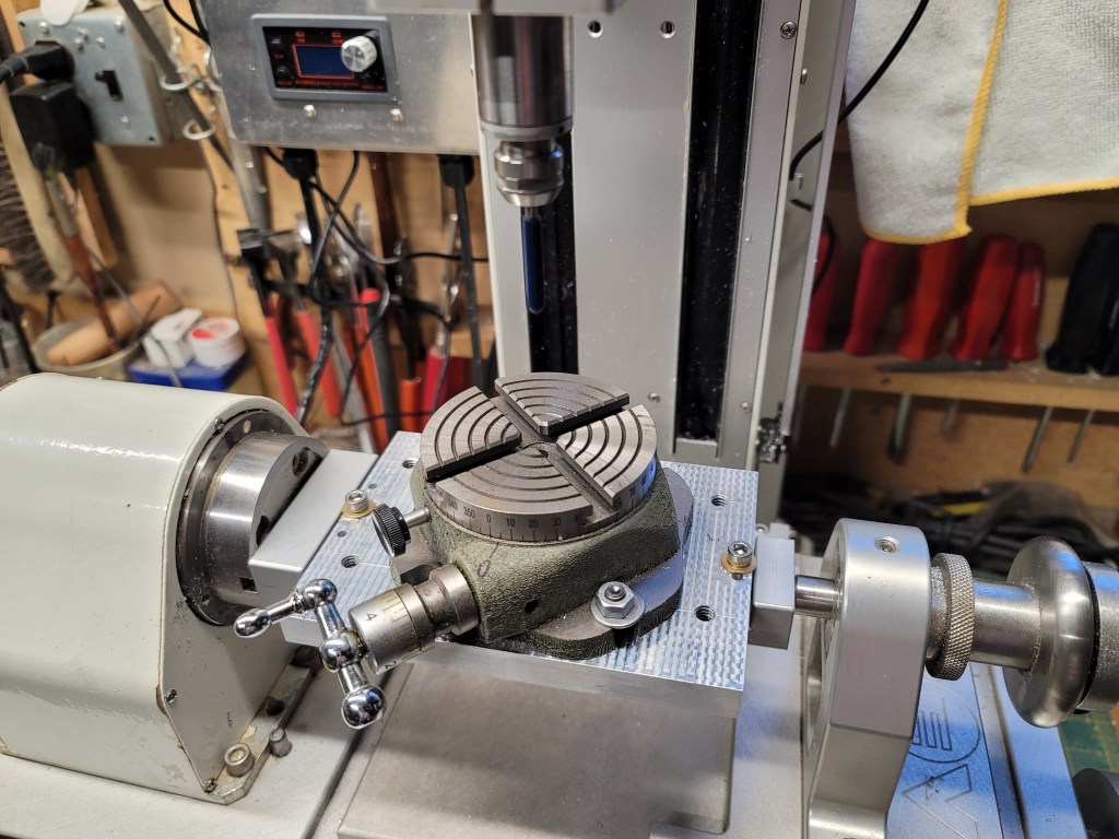 I was given an old Revo 540B cnc mill from my work that we hadn’t used in years (I just couldn’t say no.) Since I already had the Nomad I decided to remove the antiquated electronics and turn it into a 3+2 manual mill with power feed on the X and rotary axis, as that would be more useful to me. I also fit a Saunders fixture plate/vise for compatibility with the Nomad, along with a TouchDRO readout (which involved fitting a suitable rotary encoder to the 4th axis.)