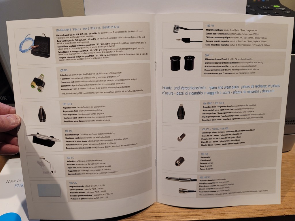 The microscope is basically unchanged from the previous PUK 5.1 model- nice wide field of view, sharp optics, adjustable eyepieces, electronic shutter, and 10X magnification (15X eyepieces are available but I’ve honestly never felt the need for them in daily use as a jeweler.) The stand has been changed slightly with a new, narrower handpiece arm and an improved adjustable height swivel foot that allows you to tilt the microscope fore and aft. The electrode length slots on the handpiece arm make setting the proper electrode length extremely fast and easy.
