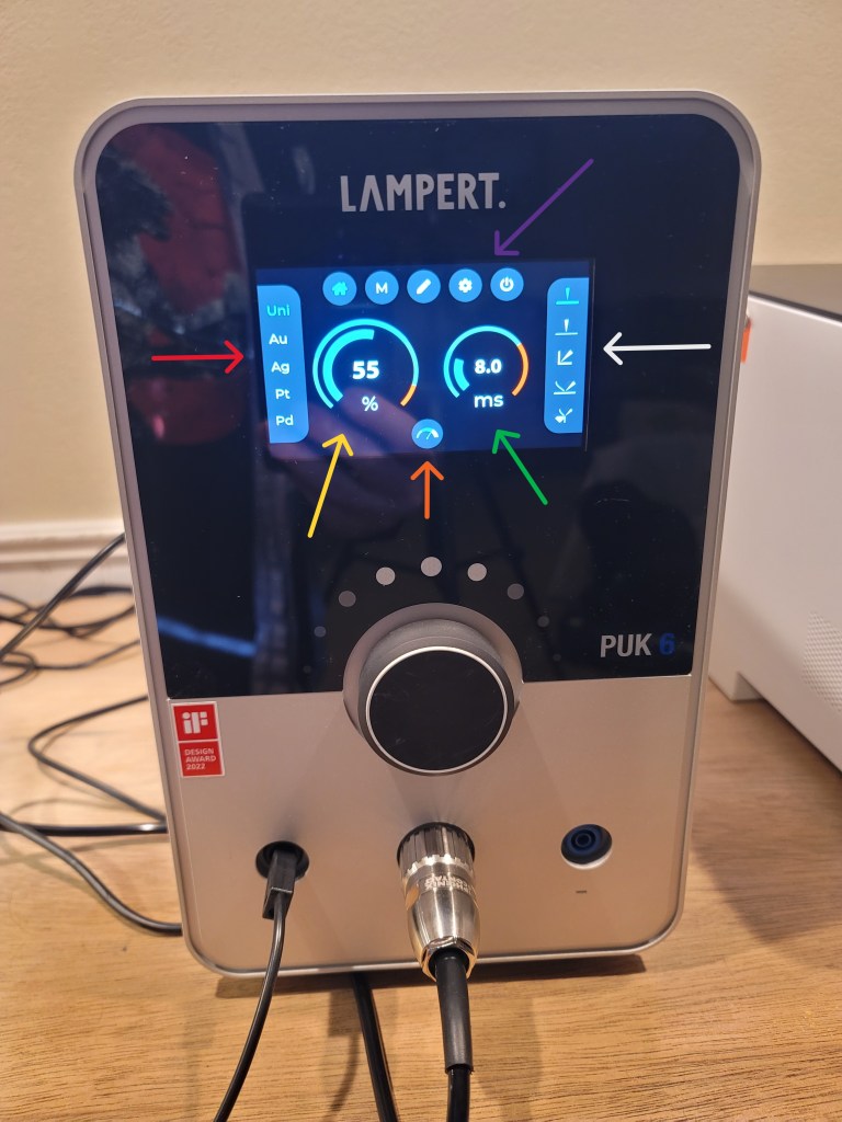 Rocking the wheel to the left (red arrow) lets you scroll through the material presets menu. There are settings for Gold, Silver, Platinum, Palladium, Bronze, Stainless steel, Titanium, Tin, Brass, Copper, as well as a “universal” setting. When you select one of these settings, the welding power and pulse duration are immediately shown in the main display area. Now when you rotate the multifunction wheel you will see the welding power increase/decrease (yellow arrow). Push the wheel and it immediately changes to give you control over the welding pulse duration (green arrow). Push the wheel again and it goes back to control over the welding power. Blue and red level indicators give you an immediate view of desired setting ranges for each material. This is a huge improvement over the previous PUK 5.1 smaller touchscreen, where you had to touch the screen to select power or duration, then immediately turn the knob to the desired setting. If you didn’t operate it fast enough it would timeout and revert back to the power setting.