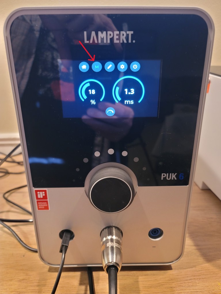 Rocking the wheel upward (purple arrow) lets you scroll between the home screen, micro mode, fixation welding, settings menu, and standby power. I haven’t used fixation mode as it requires a foot pedal and does not use the handpiece, but rather directly welds two pieces of metal clamped together.
