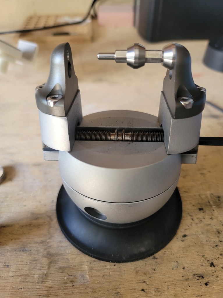 The ball vise itself is well made, with a nice blemish free surface, smooth rotating motion without any play, and the jaws clamp down securely with the jaws meeting nice and parallel. The upper half of the vise can rotate (very useful when engraving) or it can be locked in a fixed position. The vise jaws have a fair bit of play in them, but that disappears as soon as they are tightened down. The clamp to tighten down the vise rotation works perfectly and keeps the vise from rotating without having to apply too much force to the clamp screw.