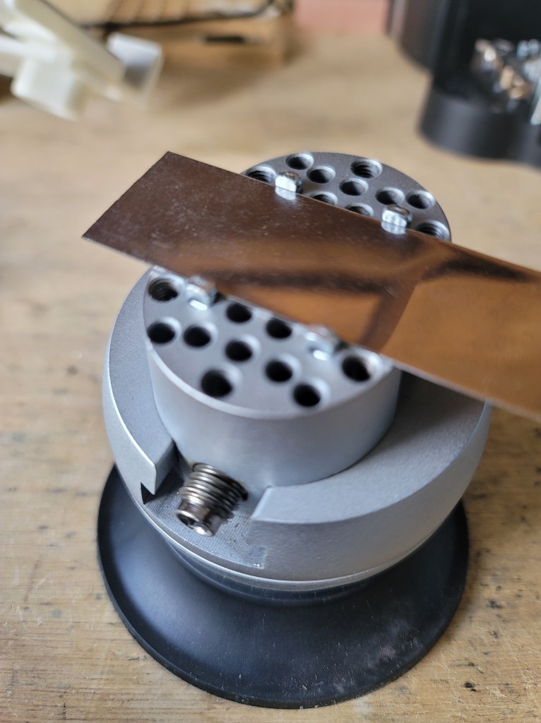 The remaining holding attachments are all secured to the vise jaws using the non threaded holes in the jaws. All of the pins fit in the holes securely with little play. There are plain steel pins, plastic coated pins, square pins, round pins (with both concave and flat sides), large flat pins with circular cutouts, and leather covered vise jaws. All of these attachments will allow you to hold everything from round bar, to flat material (both horizontal and vertical), to odd/unusual shaped items. It’s a very comprehensive setup. It can also hold a T shaped piece of aluminum with Thermo-Loc compound on it- very useful when setting stones in small bezel settings. If you have access to a 3d printer you could make all sorts of custom vise jaws to hold whatever you want.