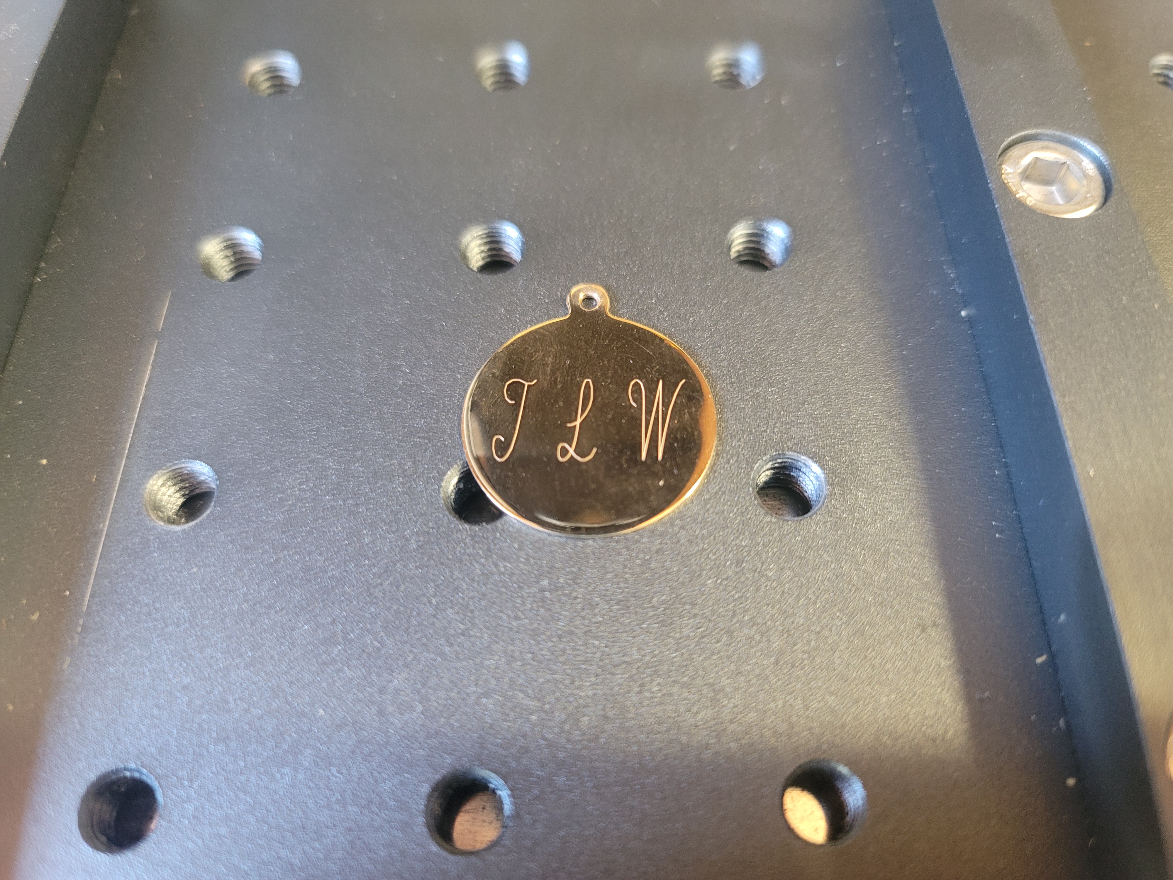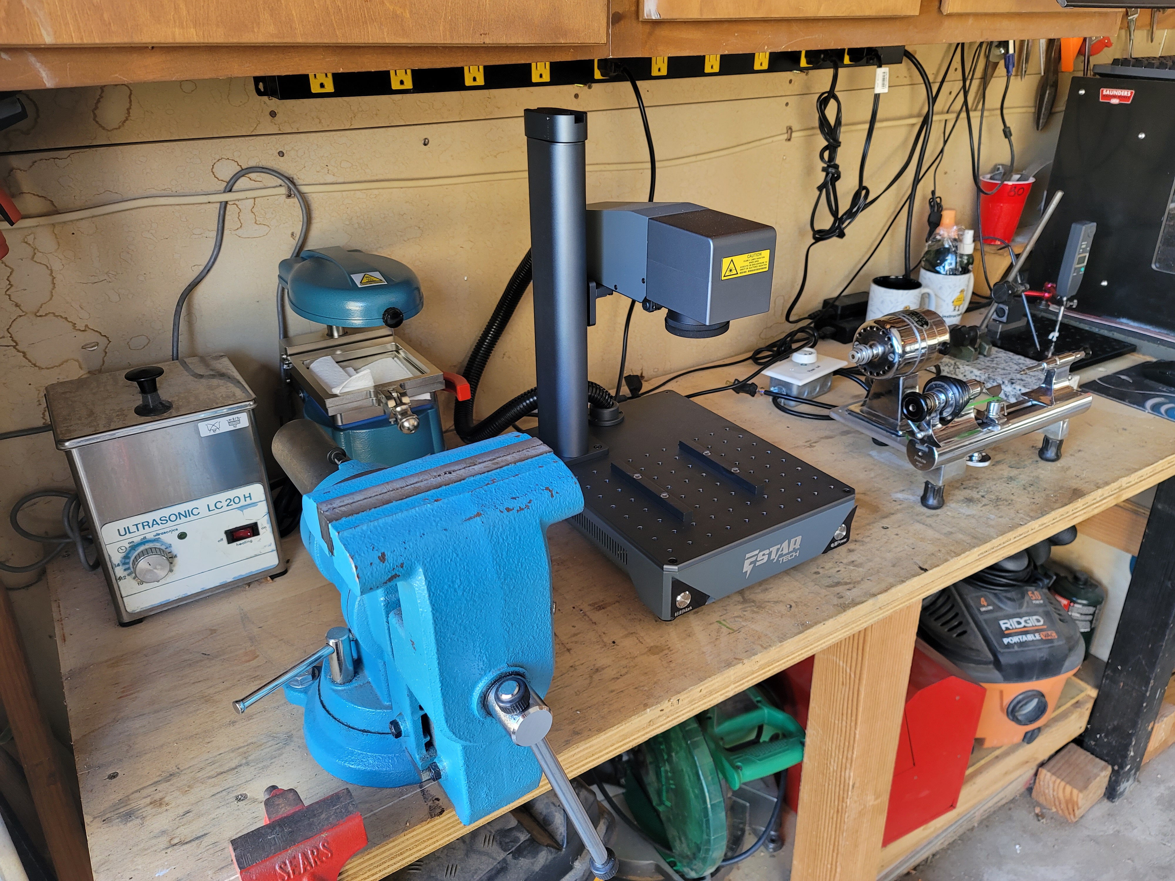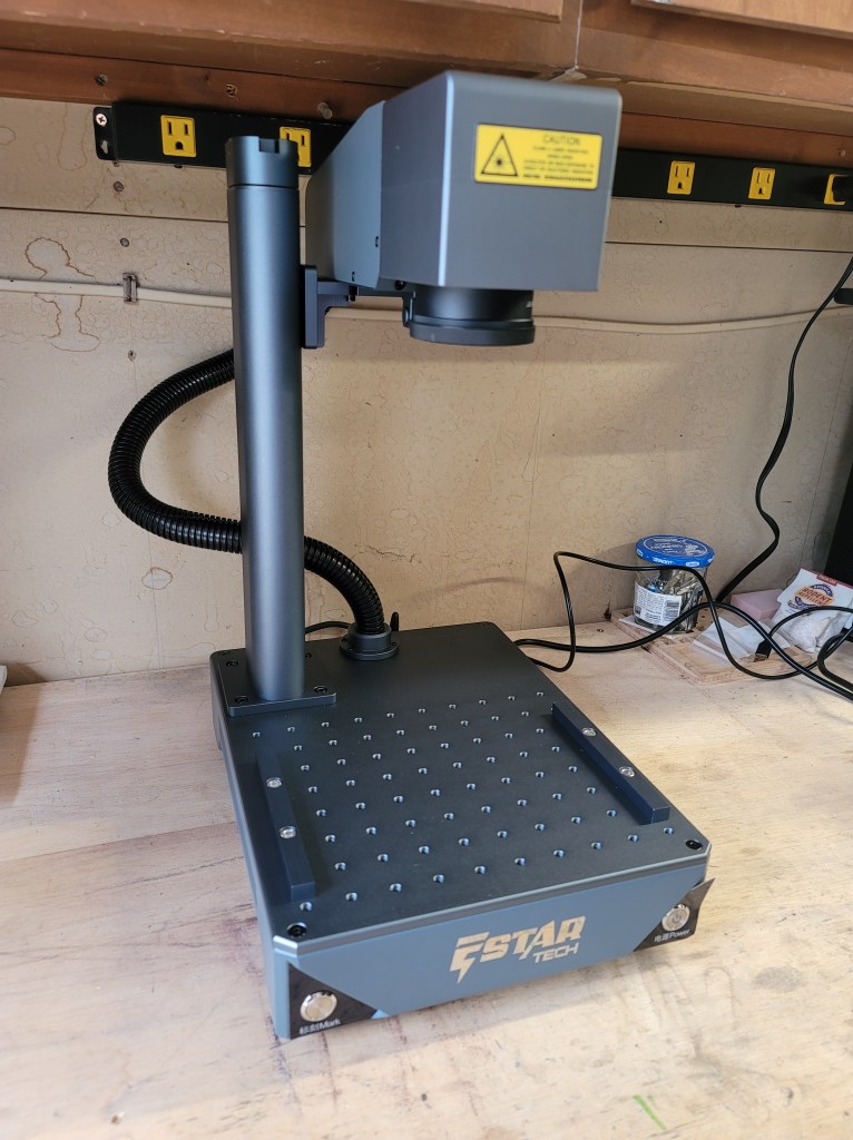 I had wanted a small desktop fiber laser for my home workshop for quite some time and when the opportunity presented itself to obtain this model I decided to take the plunge. This 20W galvo fiber laser is suitable for engraving metal and even cutting some thin metals (with multiple passes.) The work area is 100mm x 100mm.