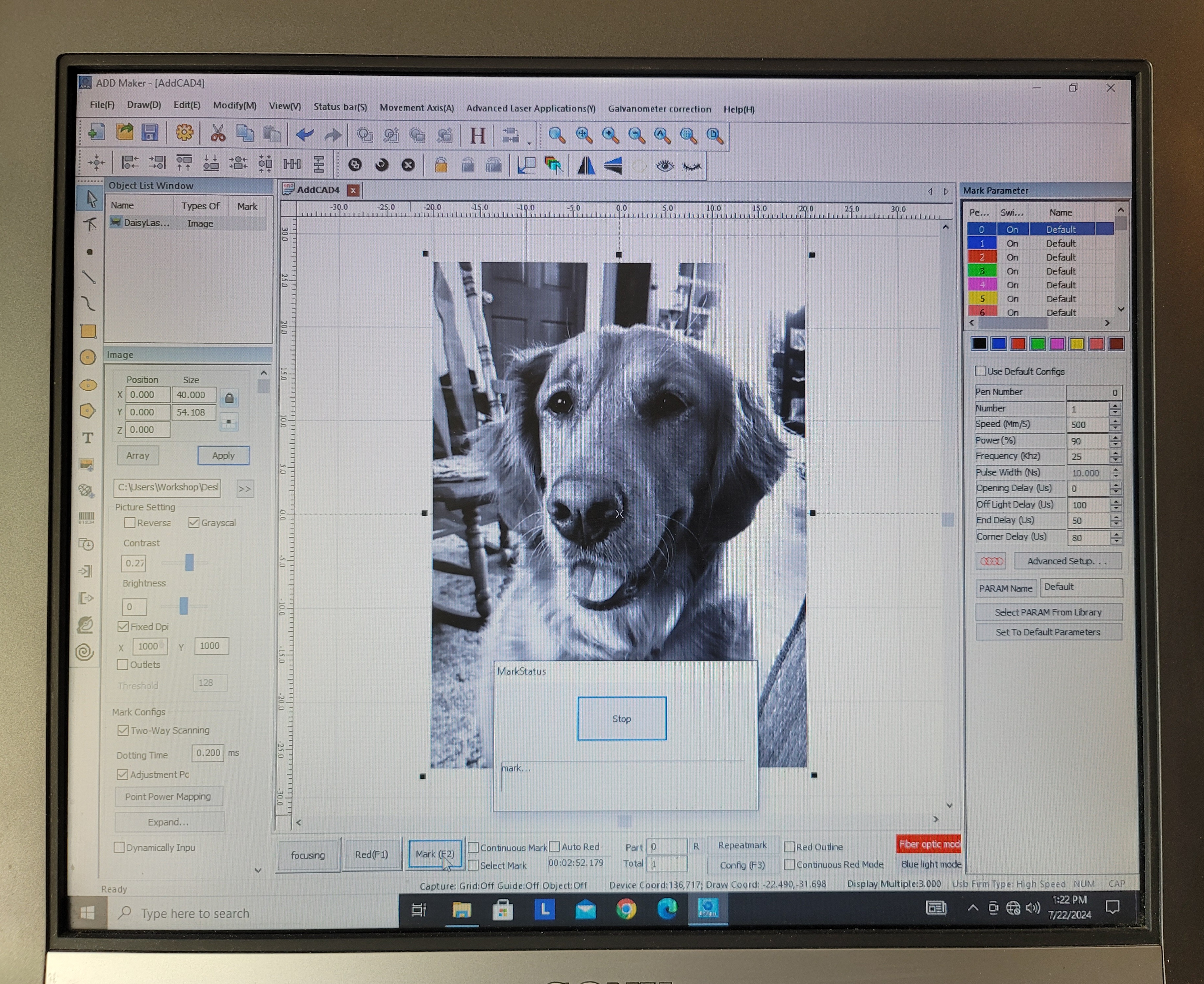 I have the laser connected to a dedicated shop Windows PC that also runs my small benchtop CNC mill. The laser software is included on a flash drive and is simple to install. The ADD Mark software is fairly intuitive, and engraving text, vector art, and photos is very easy to do. I use both Inkscape and Affinity Designer for preparing my artwork. This machine uses a BSL controller, and I believe Lightburn is planning on releasing a version of their software that works with it in the future, if you want different software to run it (I have downloaded a beta of the compatible version but haven’t tried it yet.)