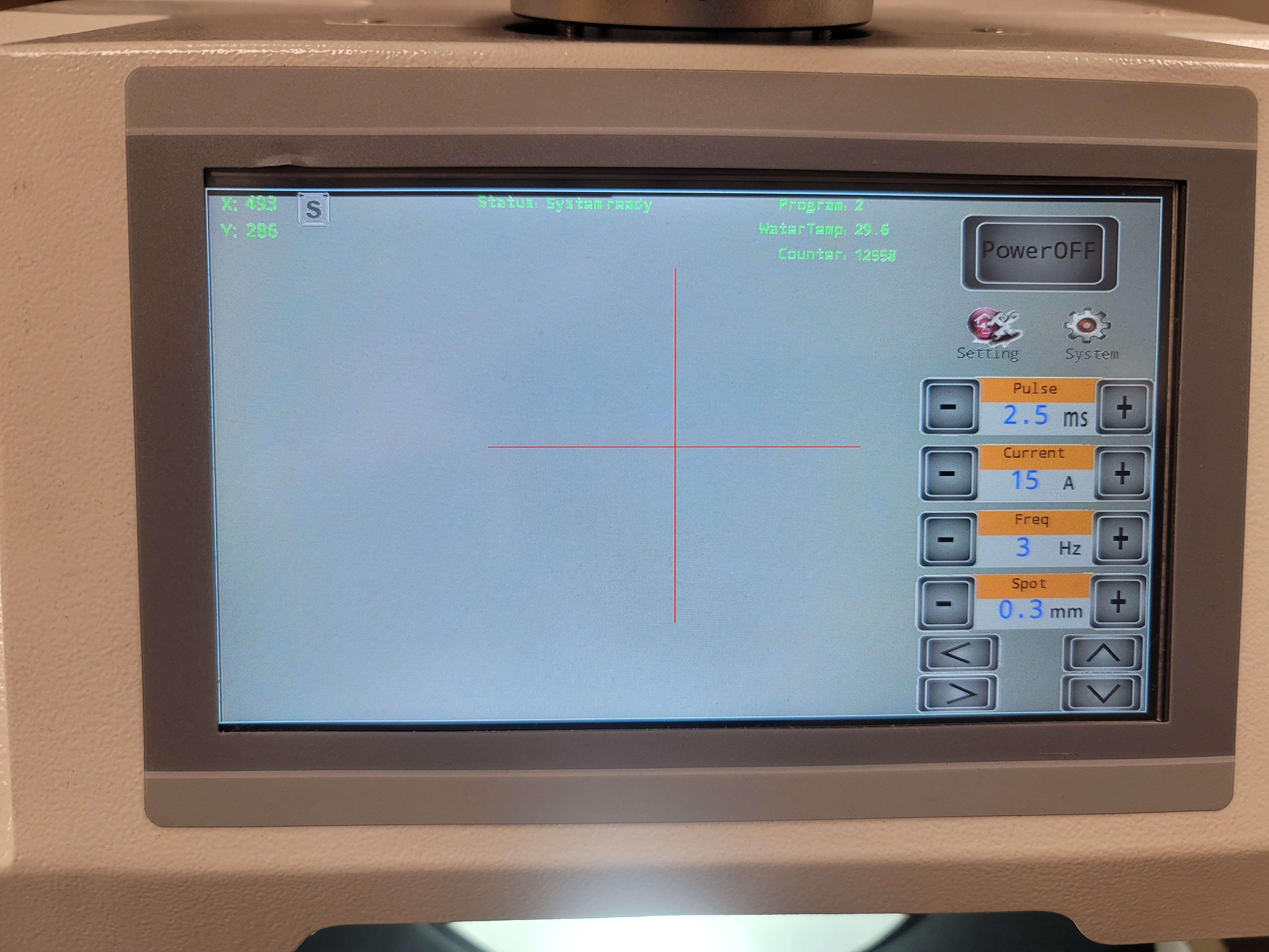 When powered on, the touchscreen displays all of the necessary information: pulse time, current (power) setting, frequency, and weld spot size. The display also shows water temperature (a really nice feature) as well as number of shots fired.