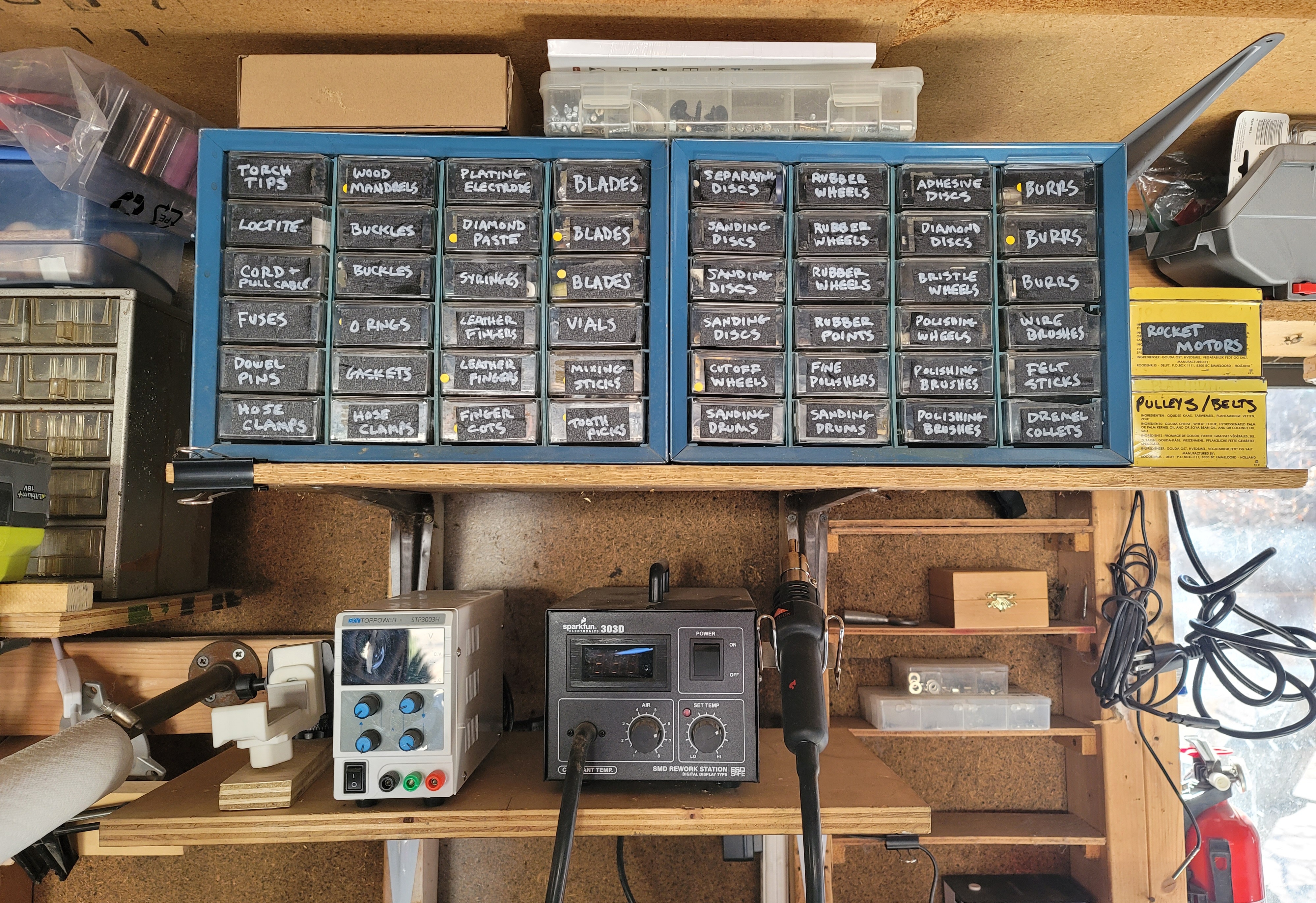 On the end near the door is a jeweler’s bench, plus another workbench. There are lots of hand tools stored here, along with the microscope, soldering iron, power supply, hot air rework tool, resin printer, and precision welding equipment. Lots of small parts are stored overhead in labeled drawers.
