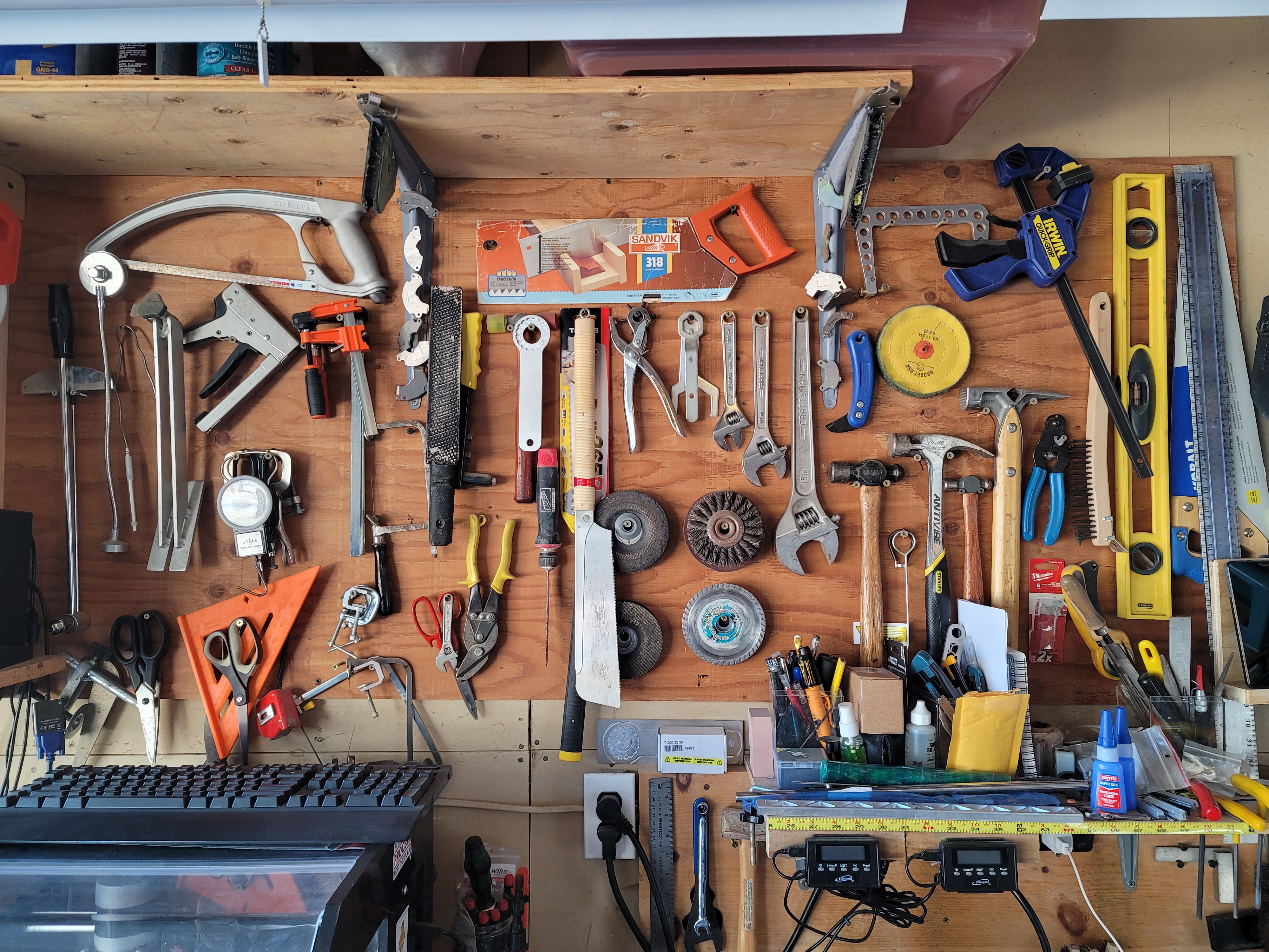 This is my happy place. The small garage workshop where I do all my hobby work. On the main workbench there is (from left to right): ultrasonic cleaner, large bench vise, vacuum former, fiber laser, watchmaker’s lathe, measuring tools, Nomad 3 CNC, Taig lathe, manual mill, belt sander, metal bandsaw, and drill press. Stored below are assorted power tools and supplies. On the wall are various frequently used hand tools.